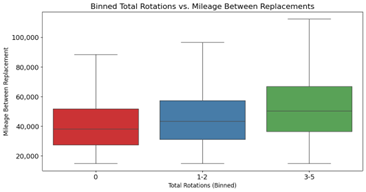 Looking across vehicles grouped by total lifetime rotation history of none, 1-2, or 3-5 rotations, the picture is consistent. Vehicles with no rotation history show the lowest median mileage between replacements and the most compressed range of outcomes. Those with 1-2 total rotations show a moderately higher median. Vehicles with 3-5 rotations show both the highest median and the widest upside distribution, with some extending well past 100,000 miles between replacements. This is not a story of outliers inflating the averages. The entire distribution shifts upward. Rotation-adherent vehicles are more likely to achieve longer tire life across the board, not just in exceptional cases.
