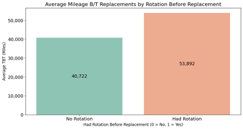 Fleet vehicles that received at least one tire rotation before their most recent replacement averaged 53,892 miles between replacements. Vehicles that received no rotation averaged just 40,722 miles. That is a difference of 13,170 miles (approximately 32% more usable tire life) associated with a single, schedulable maintenance behavior. At fleet scale, this translates directly into fewer replacements per vehicle per year, lower tire spend, and less unscheduled downtime.