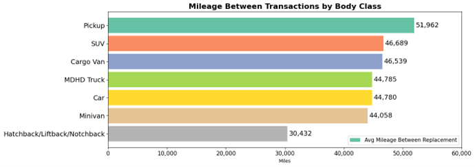 Across the analyzed fleet data, pickup trucks lead all vehicle types at 51,962 average miles between tire replacements. SUVs/MPVs and cargo vans follow at 46,689 and 46,539 miles, respectively, with cars and medium/heavy-duty (MDHD) trucks clustering near 44,780 and 44,785 miles. Hatchbacks, liftbacks, and notchbacks average just 30,432 miles per cycle, a gap of more than 21,000 miles compared to pickups. For fleets managing a mix of vehicle types, this variance has direct cost implications. Lighter-duty passenger vehicles require more frequent tire spend and more vigilant scheduling entering a high-utilization period.