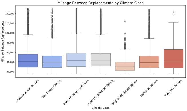 Operating environment plays a supporting role as well. Vehicles in tropical and arid climates show median tire life roughly 10,000-15,000 miles shorter than those in temperate environments such as Humid Continental or Humid Subtropical regions. Subarctic climates show the widest variance, reflecting a broader mix of vehicle types and conditions. As summer heat and UV exposure intensify across the southern and western U.S., fleets operating in those geographies face accelerated natural wear, making proactive tire inspection and rotation a higher-priority item, not a routine one.