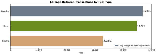 Fuel type adds another layer. Among the three primary vehicle propulsion types , gasoline-powered vehicles average 46,815 miles between tire replacements, with diesel vehicles close behind at 44,708 miles, a difference of roughly 2,100 miles that reflects the heavier load profiles of diesel-operated vehicles. Electric vehicles, however, tell a notably different story at 32,780 average miles, approximately 30% shorter intervals than their gasoline counterparts. This gap is driven by a combination of factors unique to EVs. The instant torque delivery of electric motors places higher shear stress on tires during acceleration, while the greater vehicle weight from battery packs increases the load carried by each tire contact patch. In addition, EV tires are often engineered for low rolling resistance, which can reduce tread volume and increase wear rates relative to standard all-season tires. For fleets with a growing EV presence, this means tire budgets and rotation schedules calibrated for internal combustion vehicles may systematically underestimate the service needs of electric assets. Understanding fuel type composition at the fleet level creates more accurate tire life benchmarks and more realistic cost expectations going forward.