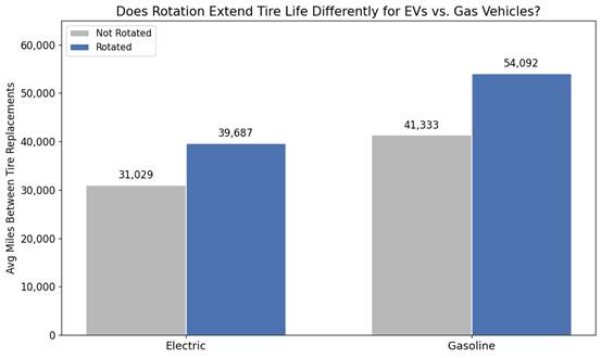 Electric vehicles in the fleet replaced tires roughly 25% sooner than comparable gasoline vehicles when neither group had prior rotations (31,029 vs. 41,333 miles, respectively), consistent with the additional torque stress and battery weight characteristic of EVs. However, the benefit of tire rotation was nearly identical across both powertrains: rotated EVs extended tire life by 27.9%, compared to 30.9% for gasoline vehicles, a difference that is not statistically meaningful. Importantly, this EV finding is statistically significant (p < 0.0001), despite the smaller EV sample. The practical implication is clear: rotation discipline is just as valuable for EVs as it is for gas vehicles, and given that EVs start at a shorter baseline, the cost of skipping a rotation is proportionally higher for an EV owner.